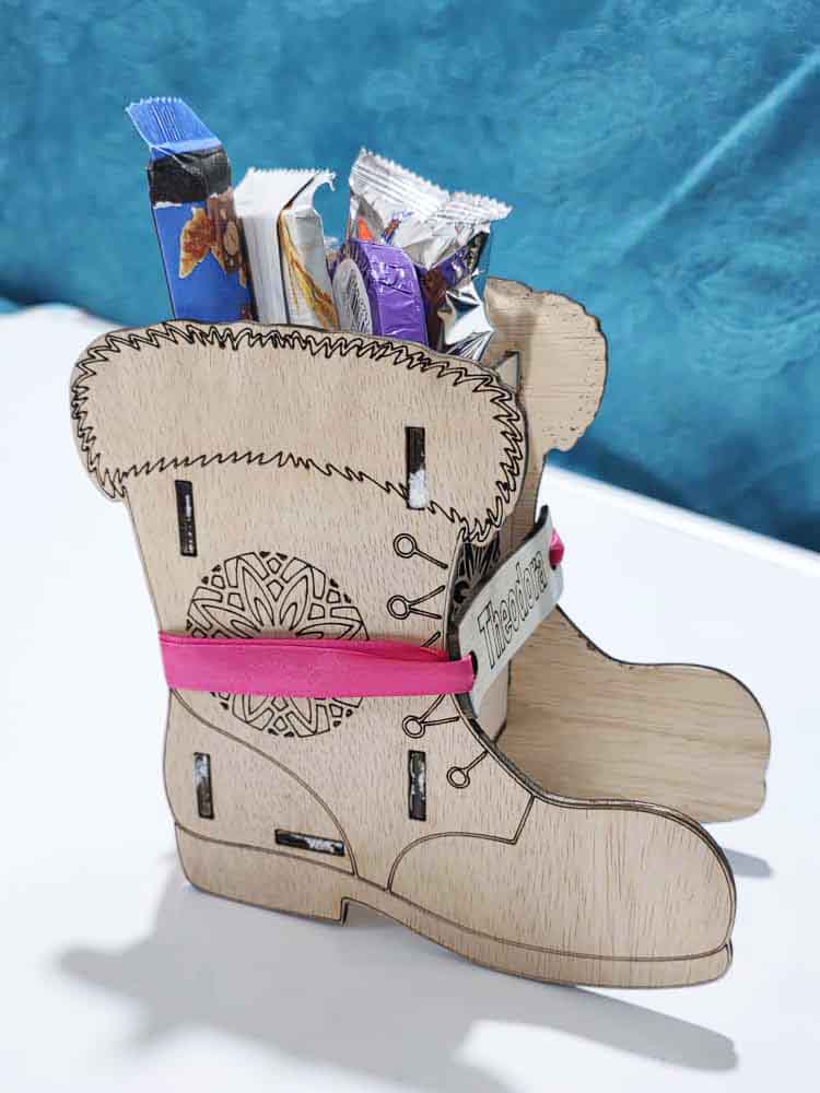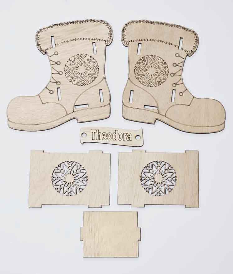 Produs personalizabil! Cutie pentru cadouri Gheata lui Moș Nicolae, realizată din placaj, cu dimensiunile de18x18x9 cm. Conține 6 piese, cu grosimea de 4 mm. Poate fi folosită pentru a fi umplută cu dulciuri sau mici atenții pentru a fi găsită de copii în dimineața de Moș Nicolae. Setul vine neasamblat, pentru a fi montat de copii, iar plăcuța cu numele copilului este personalizabilă. Montajul ghetuței este intuitiv, ca în fotografiile atașate. Pentru lipit, recomandăm aracetul.