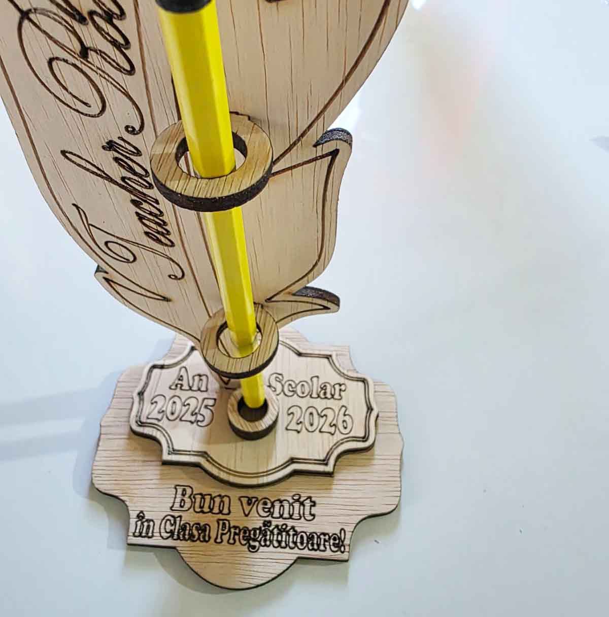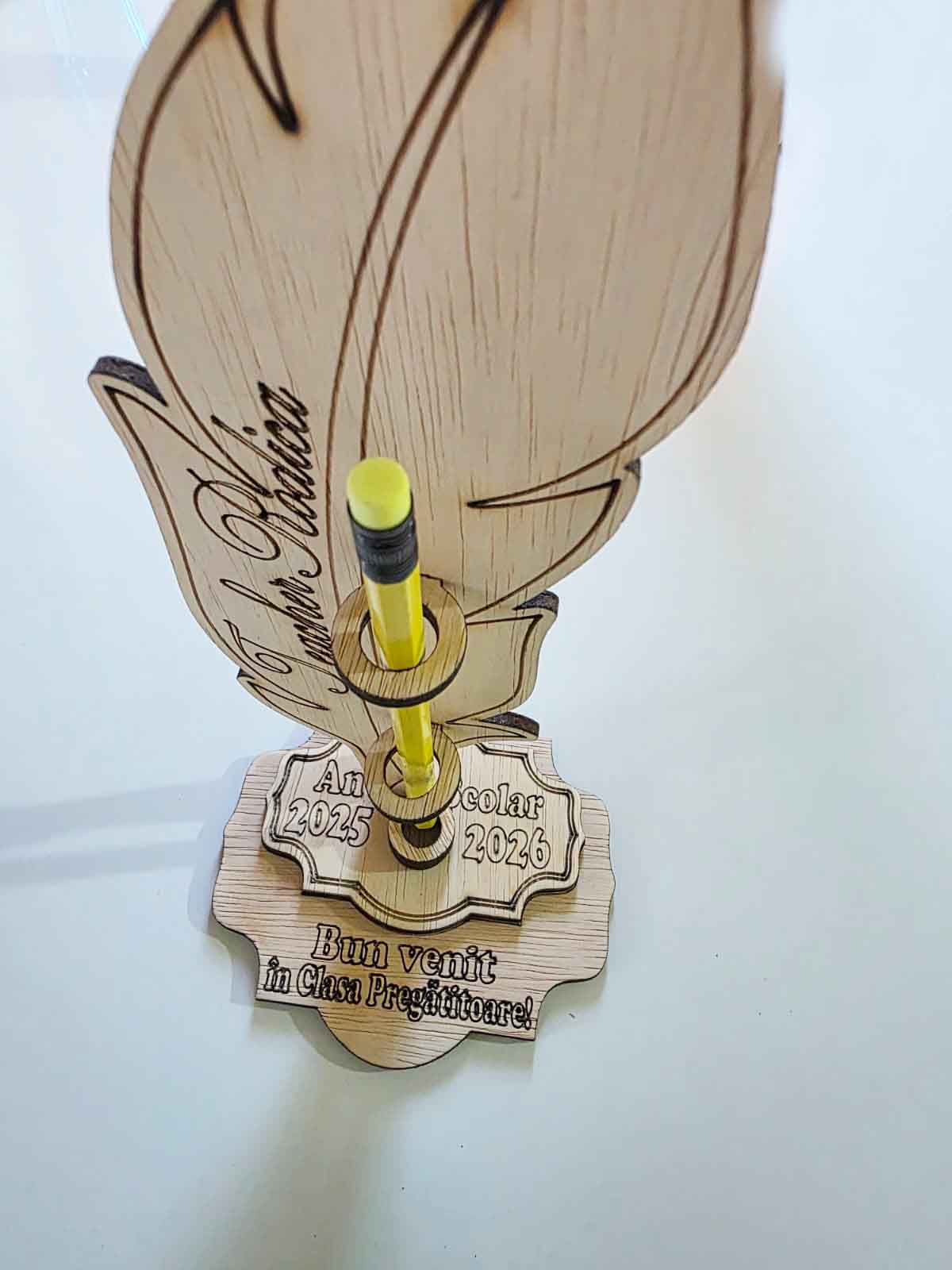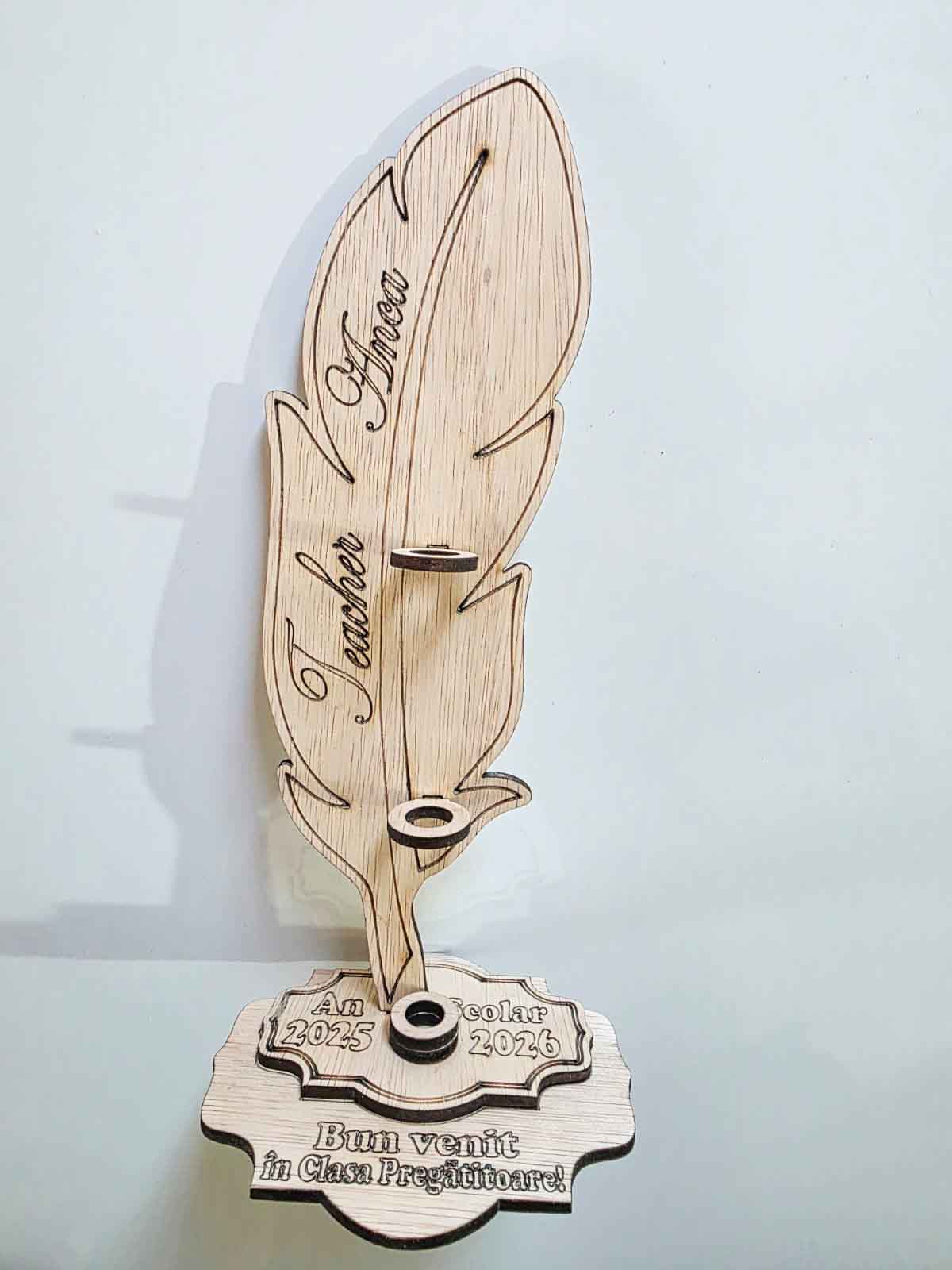 Suport personalizabil pentru elevii care intră în Grupa Pregătitoare, conceput special pentru festivitatea Noului An Școlar. Este realizat din placaj, având dimensiunile de 25 x 11 cm. Grosimea este de 4 mm. Pana se personalizează cu numele cadrului didactic, iar suportul orizontal se personalizează cu informațiile dorite de dvs. Suportul vine gata asamblat, exact ca în imagini, fără creioanele folosite în scop decorativ. ATENȚIE! A nu se lăsa la îndemâna copiilor mai mici de 3 ani! Este necesară supravegherea permanentă a unui adult!