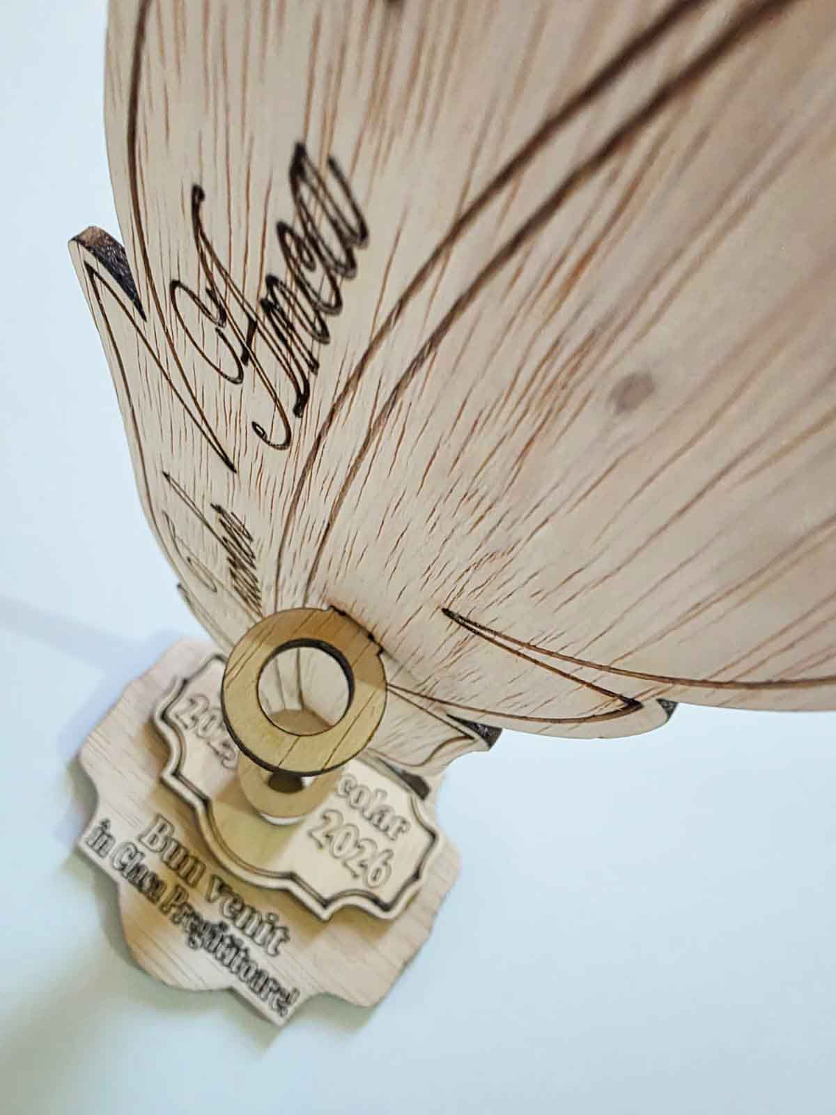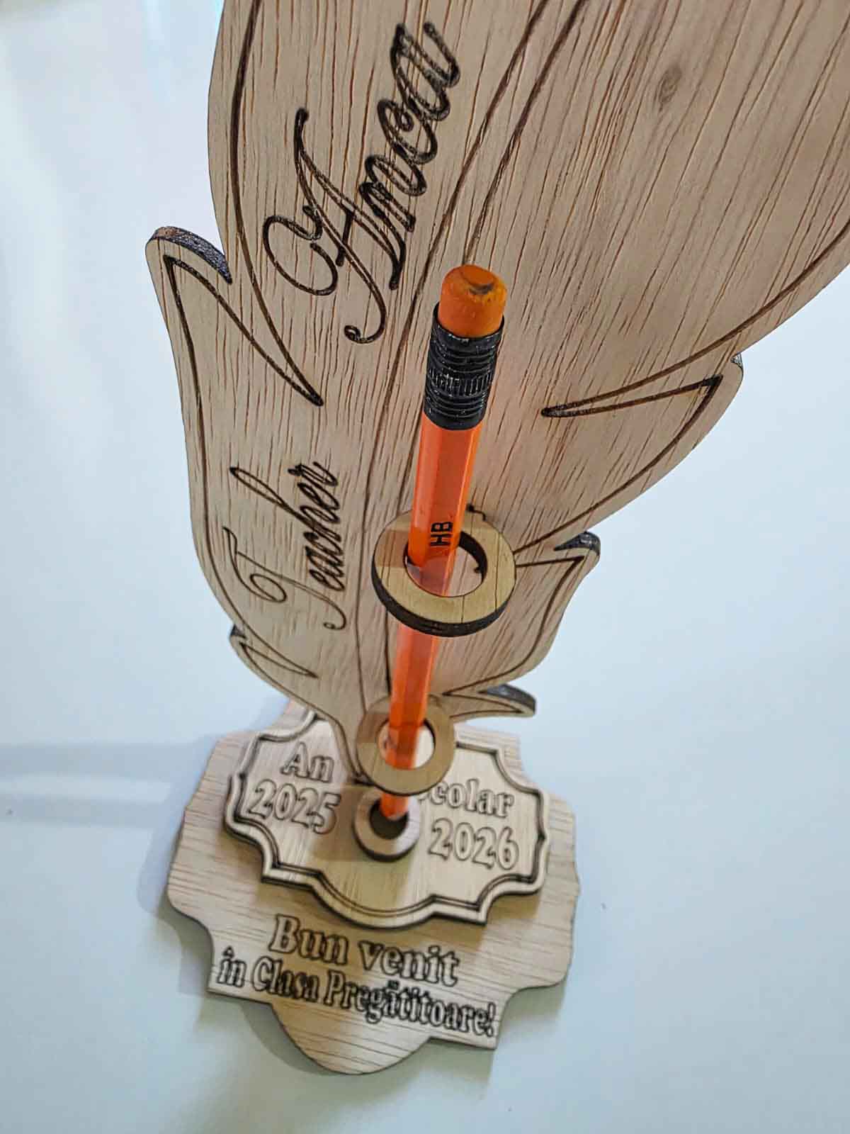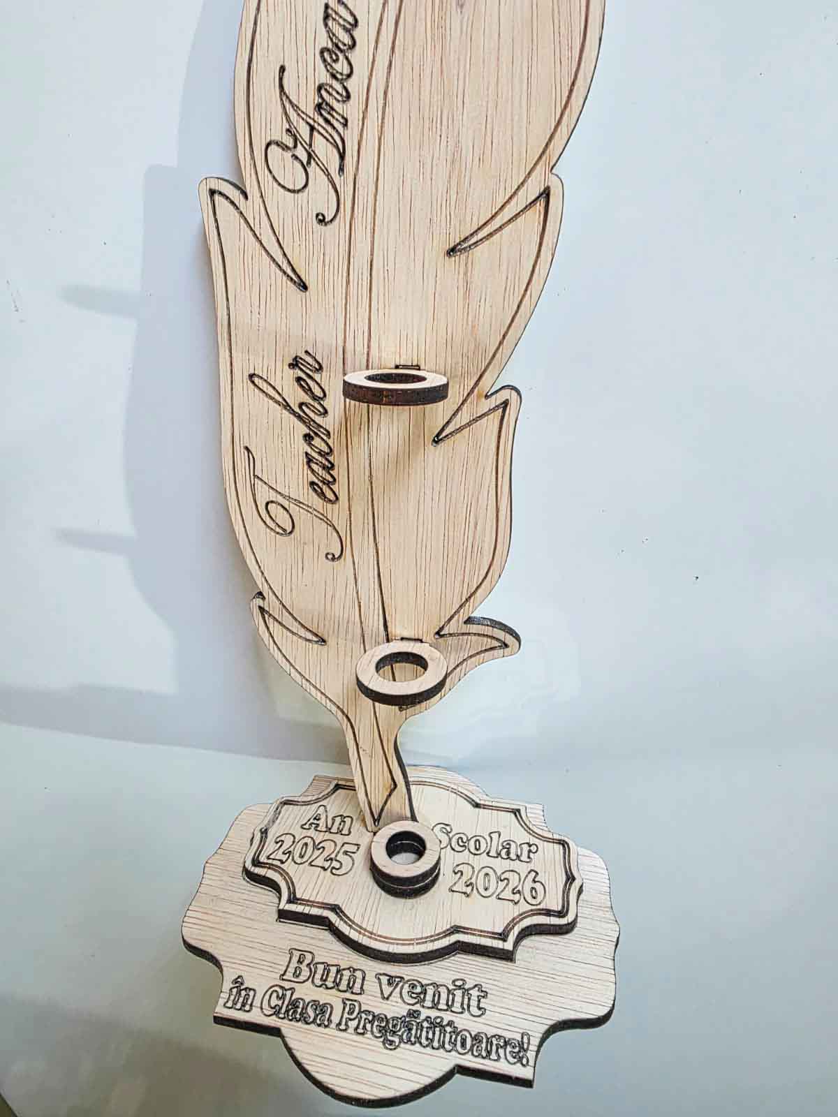 Suport personalizabil pentru elevii care intră în Grupa Pregătitoare, conceput special pentru festivitatea Noului An Școlar. Este realizat din placaj, având dimensiunile de 25 x 11 cm. Grosimea este de 4 mm. Pana se personalizează cu numele cadrului didactic, iar suportul orizontal se personalizează cu informațiile dorite de dvs. Suportul vine gata asamblat, exact ca în imagini, fără creioanele folosite în scop decorativ. ATENȚIE! A nu se lăsa la îndemâna copiilor mai mici de 3 ani! Este necesară supravegherea permanentă a unui adult!