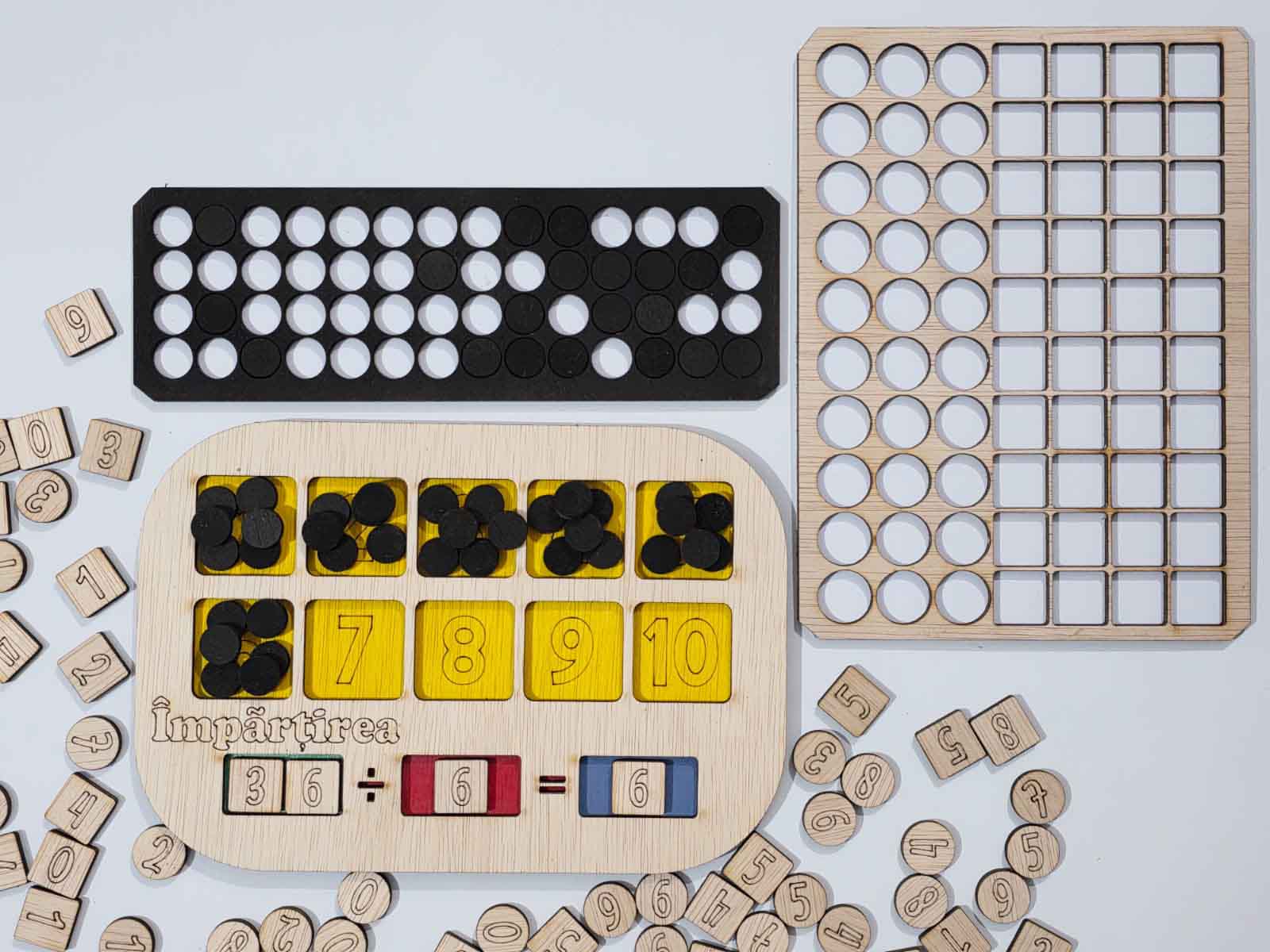 Sistem de calcul pentru calculul împărțirii, realizat din placaj, având dimensiunile de 28x19 cm. Grosimea plăcii de calcul este de 8 mm. Modul de calcul este exemplificat în video. Setul conține sistemul de calcul , 8 seturi de cifre pătrate și rotunde și un set de buline mici vopsite în negru. Poate fi personalizat prin realizarea unei plăcuțe cu prenumele elevului. Este colorat cu vopseluri acrilice, non- toxice și non-alergice.