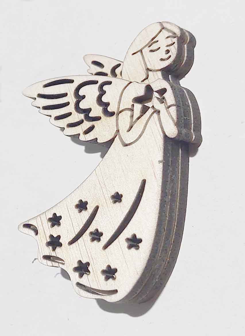 Decorațiune pentru agățat în bradul de Crăciun, din placaj, cu dimensiunile de 8,5x6 cm. Grosimea pieselor este de 9 mm. Îngerașii sunt compuși din 3 straturi suprapuse, care sunt deja lipite. Produsul se adresează cu precădere copiilor fără experiență în creația de handmade și decorațiuni. Piesele pot fi colorate cu tempera, carioci, culori acrilice sau aquacolor. Modelul se poate decora cu diferite accesorii, neincluse.